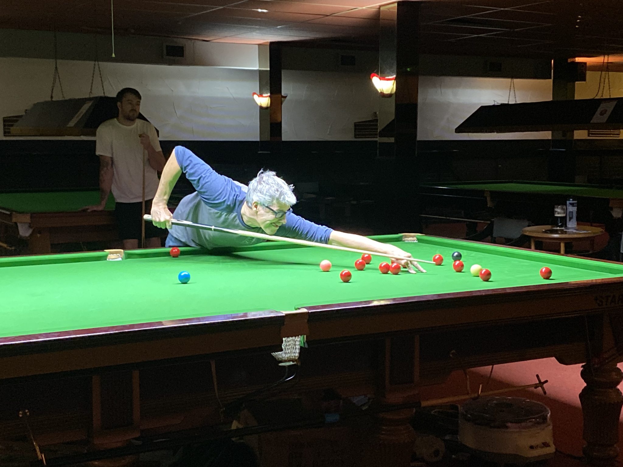 Ellis was in first but after potting a good red he missed a blue off the spot. An in-off by Richard left Ellis with another chance, but after potting a red he missed the green off the spot. This allowed Richard to capitalise, potting red, brown, red for a break of 6. Should have been more but a twitch on the pink ended the break prematurely. It was tense stuff and Ellis now hit back with a red and black for 8 points to narrow Richard’s lead to just 6. It was nip and tuck for a while before Richard made a nice 20 break to take a 15 point lead with three reds remaining. Ellis potted a red but missed a tricky black to the middle. Richard then potted a lovely long red but the cue ball finished in no man’s land, forcing him to try for a snooker. Fortunately for Ellis his attempt was unsuccessful, but his sense of relief was brief as he went in off! Richard then fluked the final red to add to Ellis’s misery. Ellis now trailed by 20 points, with 27 remaining. Richard then fluked a snooker and Ellis not only failed to escape but he also left the cue ball behind the black. He was put in again by Richard and again he missed the yellow. Richard was now 28 in front with on 27 on the table. Ellis potted a good yellow and laid an excellent snooker behind the pink (see photo). Richard failed to escape, hitting the blue which meant Ellis could now win, 21 the difference with 23 on the table. Ellis potted the green but played a poor safety on the brown leaving Richard a chance at one of his trademark long pots. Not this time though as he missed it, only to snooker Ellis behind the pink! Ellis played an excellent shot to escape the snooker and he also managed to leave it safe. Ellis now trailing by 18 points with 22 on the table. Amazingly, Richard fluked another snooker and this time Ellis fouled, hitting the black. Richard then stepped up and potted brown and blue to take frame and match. A terrific 4-3 win for Richard after being 2-0 and 3-2 down.